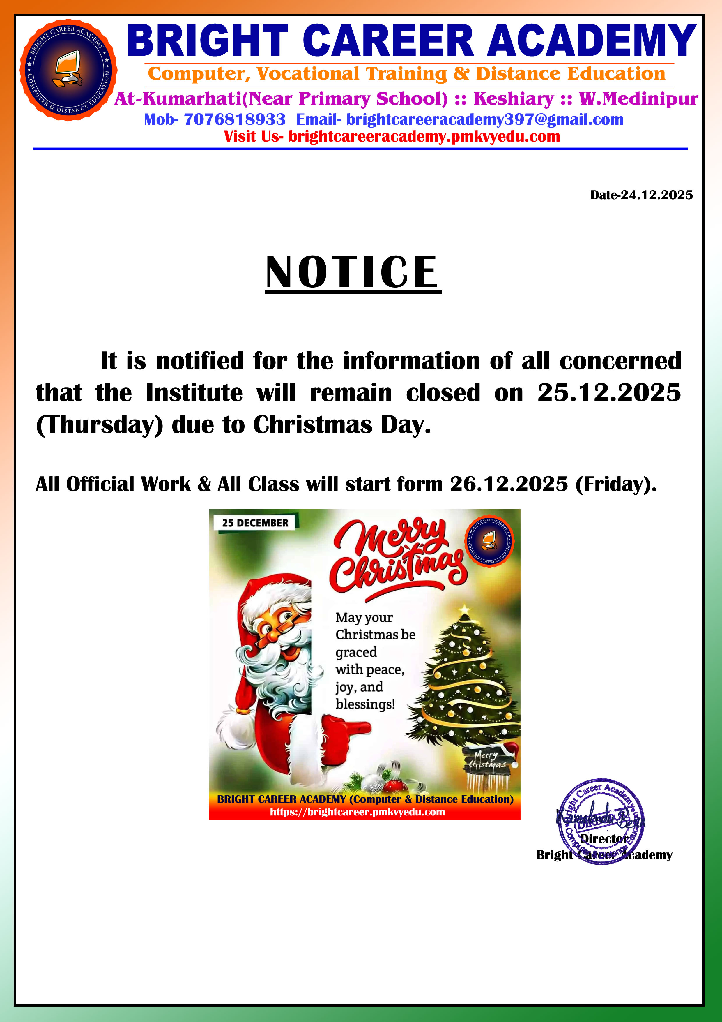 Download 02 Jan 2026It is notified for the information of all concerned that the Institute will remain closed on 25.12.2...
