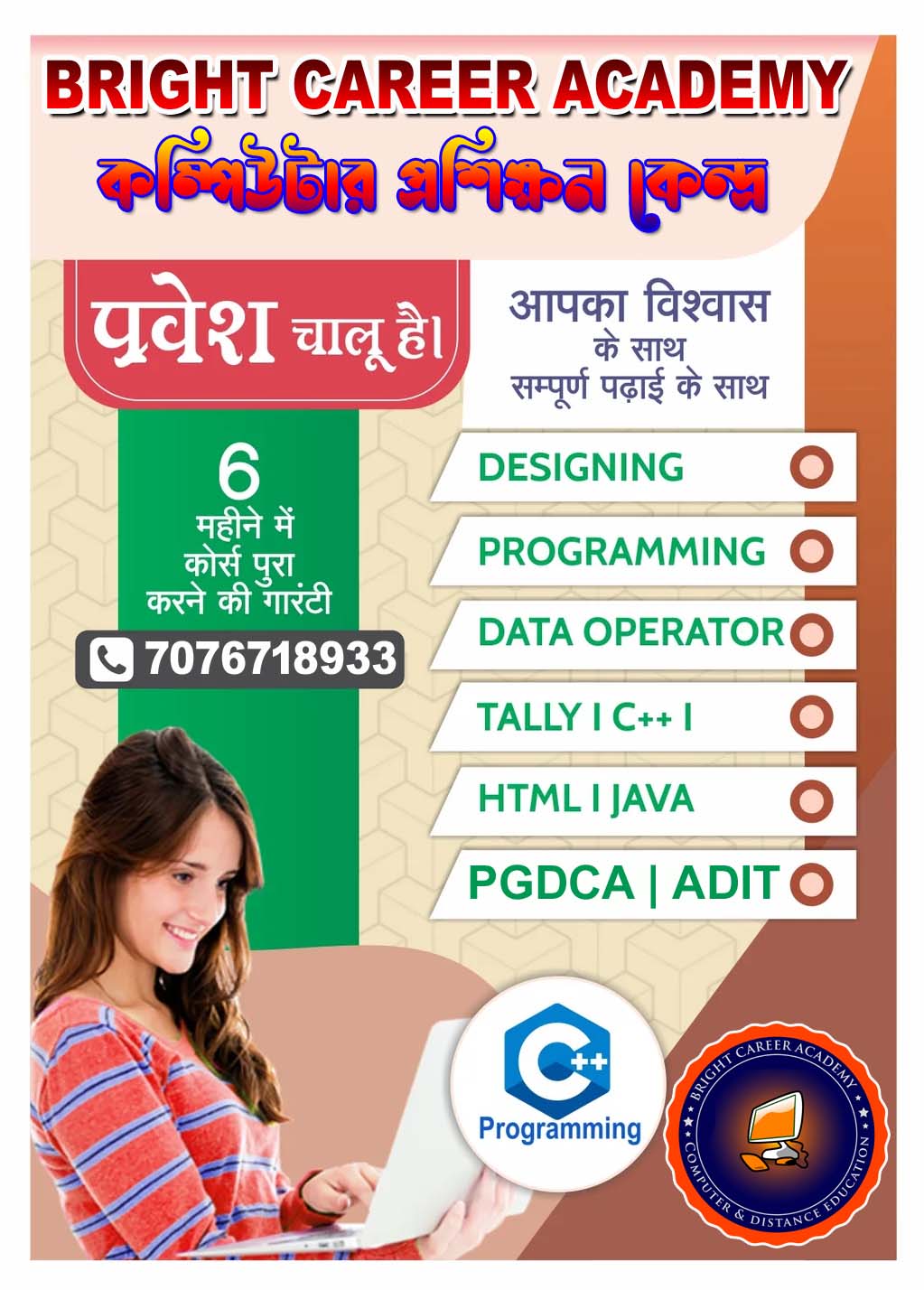 Welcome to BRIGHT CAREER ACADEMY, a premier computer coaching institute dedicated to empowering students with essential digital skills. Our mission is to provide high-quality education in computer literacy, programming, software applications, and advanced IT concepts. Whether you are a beginner or looking to enhance your expertise, our well-structured courses, experienced faculty, and hands-on training ensure a comprehensive learning experience.